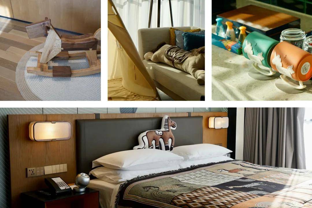 西安高新凯悦尚萃酒店在打造亲子主题客房时,以链接社区的维度,与本地的两位小朋友Jason & Micheal一同联名定制了手绘床单、抱枕、靠枕等客房用品,儿童帐篷、木马摇椅以及定制儿童主题洗漱备品、水杯等,满足了小住客的基本需求,而两兄弟天马行空的画风,则从儿童视角和内心切入内心需求,与接下来的小住客形成了空间互动,深受亲子客群喜爱。