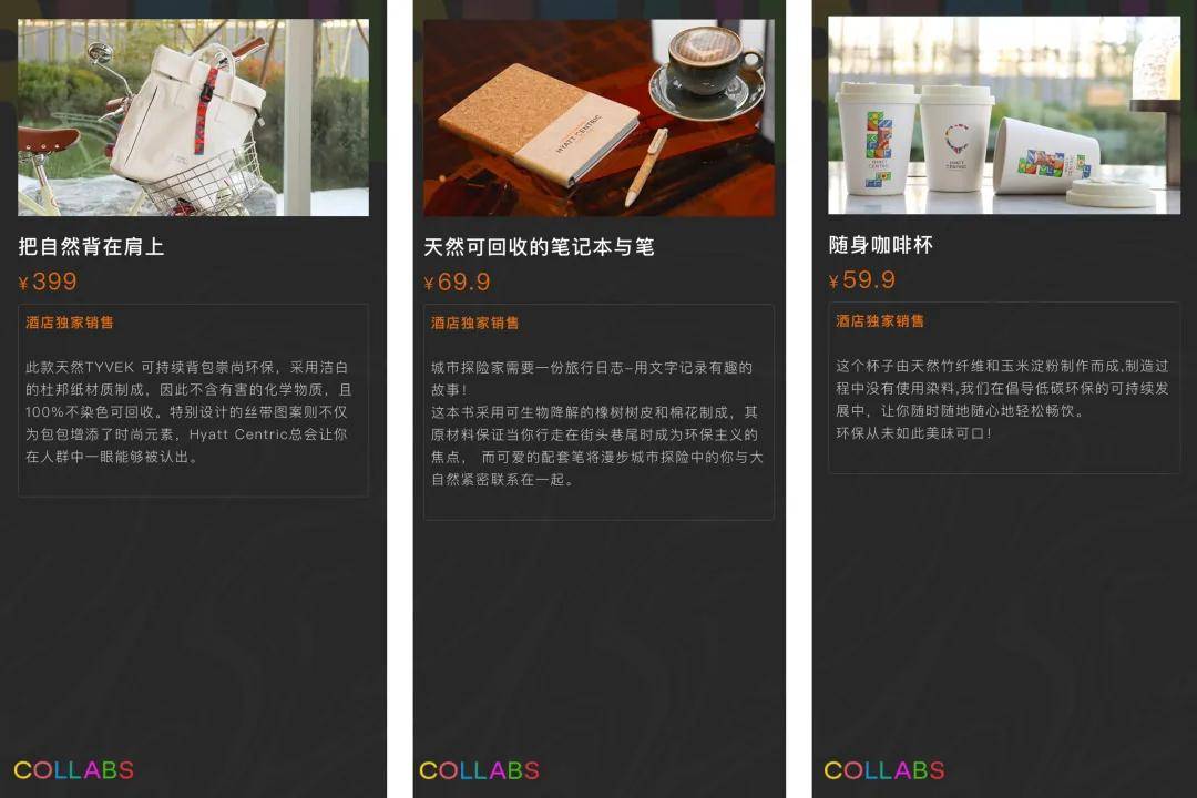 除了员工制服,在大堂摆设的酒店周边文创很多也是环保友好,背包是纸做的,礼品咖啡杯是玉米杆做的,笔记本和笔是红酒木塞做的……每一位游客都能成为可持续发展的参与者。